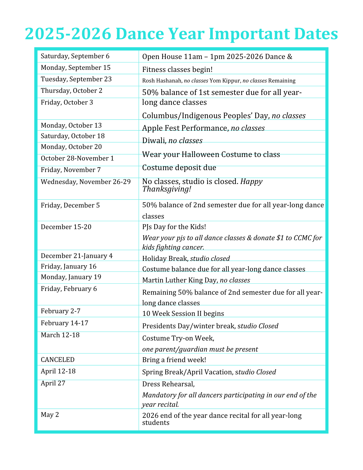 Remaining 1st semester balance of all year-long dance classes is due by October 3, 2025